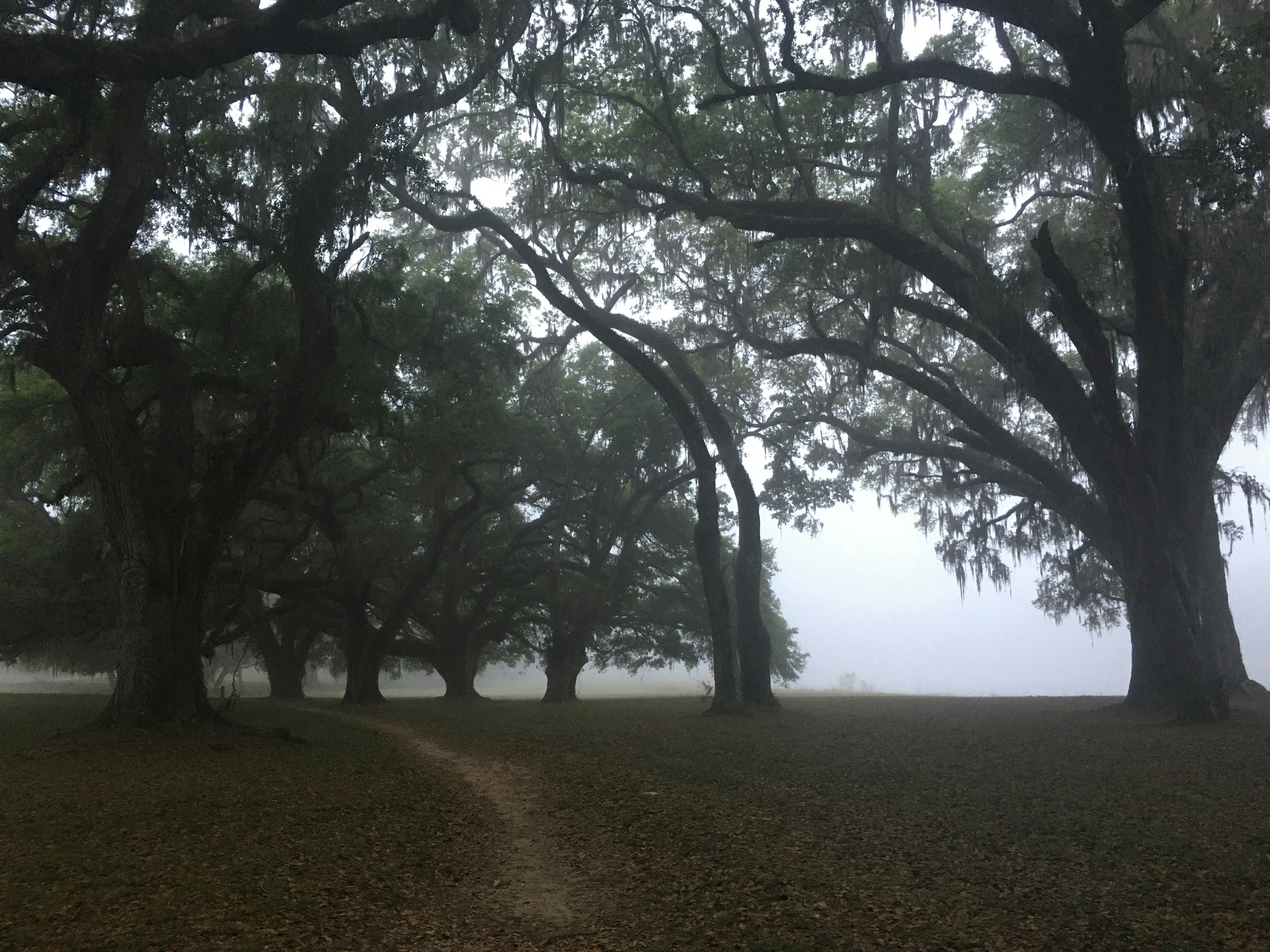 You hear it before you see it — the soft crunch of dew-heavy grass underfoot, the low hush of wind through old oak canopy. You left your shoes at the edge of the path. The earth is cool. Your shoulders drop an inch.