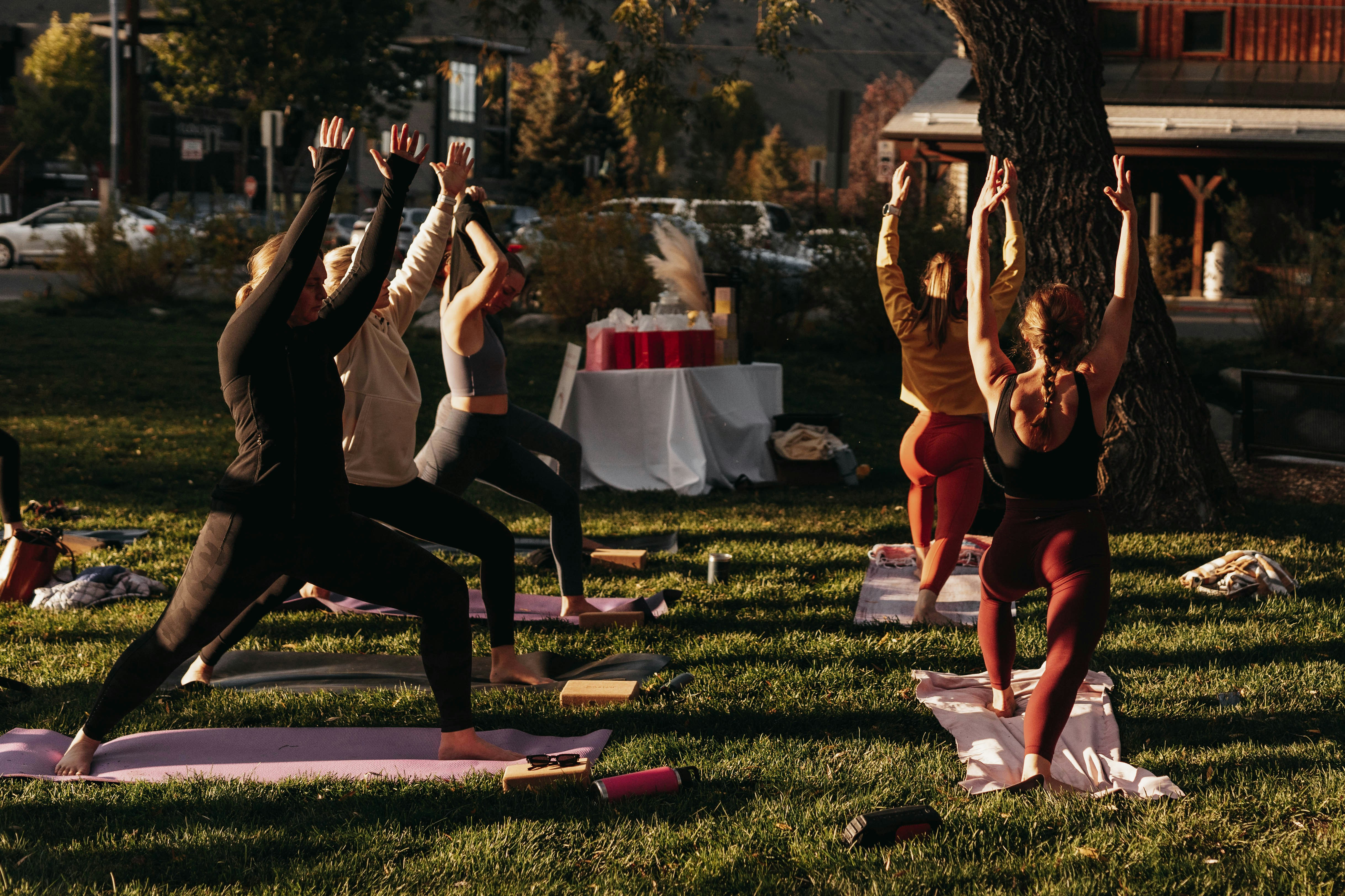 The sequence builds. Bodies rise and fold together — a slow tide. The oak leaves answer with their own movement. For a few minutes you are not a product manager or a new mother or a retired engineer. You are breath and weight and sky.